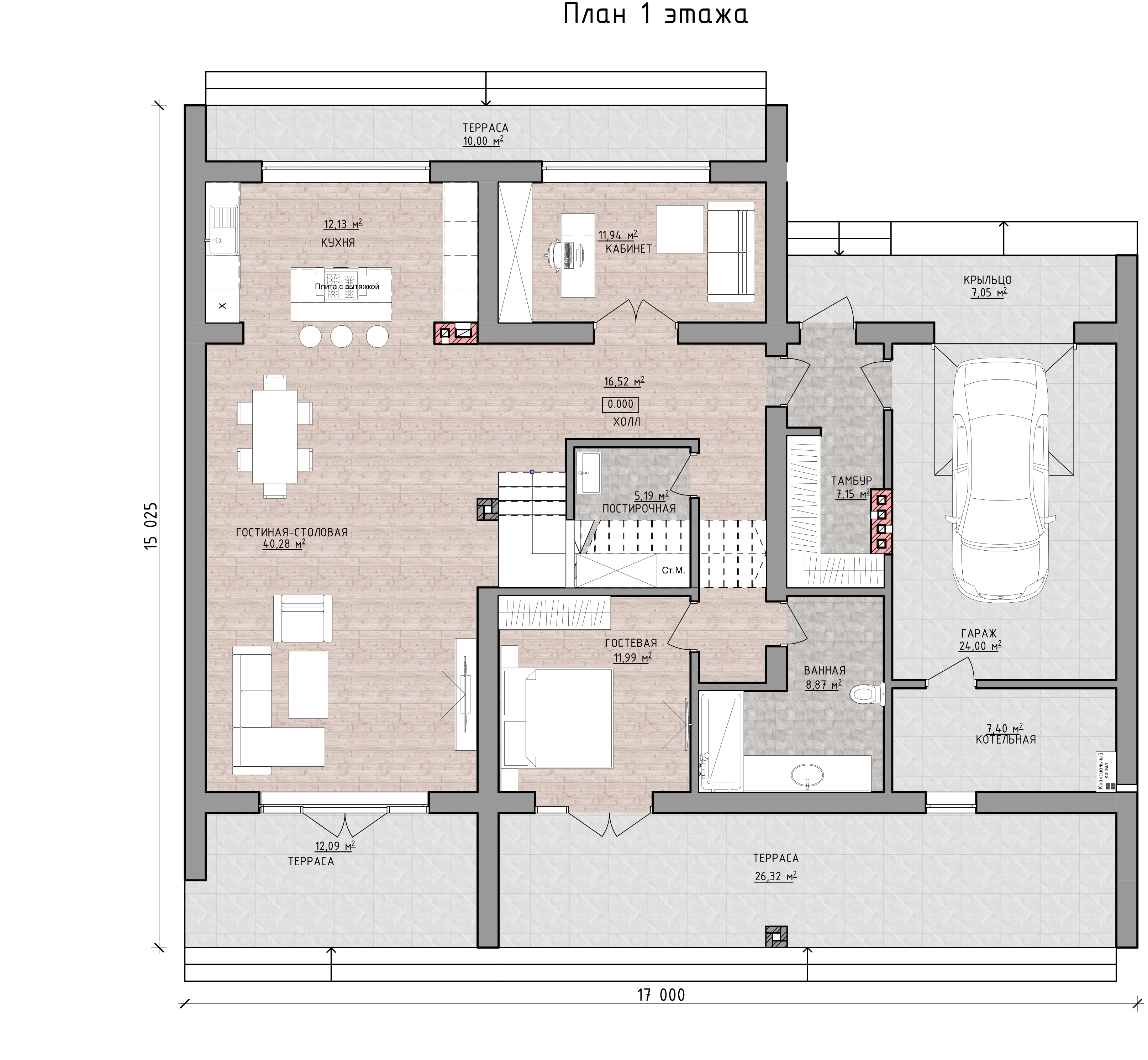 - Габариты — 11.40 × 14.35 м.